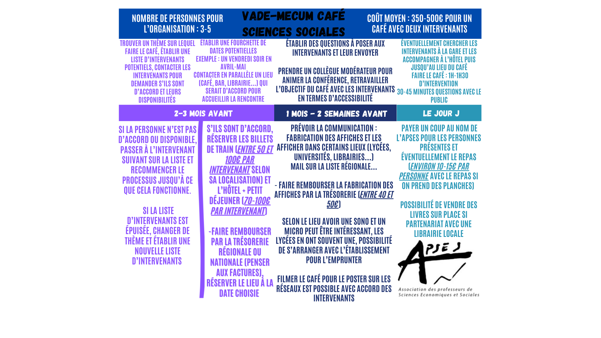 Pour vous donner envie de vous lancer , vous trouverez déjà ici des conseils pour organiser un café sciences sociales; d’autres Vademecum sont en cours d’élaboration. A suivre donc !